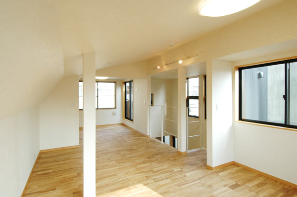 1階フリールームは書斎・寝室・趣味の部屋など多目的に使用可能、窓から見る坪庭はオシャレで落ち着いた寛ぎを与える。住まう者のセンスでフリールームの延長の様なテラスを楽しんで貰えるだろう。(但しテラスとして使用される場合の駐車場は1台)3階フリールームはあらゆる家族構成に対応、子供が二人の場合小さい時は1つの部屋で次第に個室が必要になった場合自由に部屋を仕切ることが出来る。また子供の独立した場合再び1フロアに戻してゆったり空間が楽しめる。